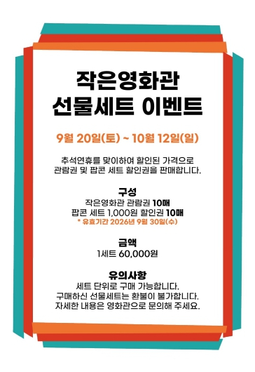 성주별고을시네마(창의문화센터 3층)는 민족 대명절 추석을 맞아 9월 20일부터 10월 12일까지 ‘추석맞이 선물세트 이벤트’를 진행한다.이번 선물세트는 6만 원에 영화 관람권 10매와 팝콘세트 1천 원 할인권 10매로 구성됐으며, 세트 단위로만 구매할 수 있다. 특히 구매한 선물세트는 내년 2026년 9월 30일까지 사용할 수 있어 장기간 활용이 가능하다. 다만, 구매 후 환불은 불가하다.선물세트는 성주별고을시네마 창의문화센터 3층 매표소에서 현장 구매할 수 있다. 착한 가격으로 가족·지인과 함께 영화를 즐기고, 팝콘 할인 혜택까지 누릴 수 있어 명절 선물로도 손색이 없을 것으로 기대된다.아울러, 박찬욱 감독의 신작‘어쩔수가 없다’가 제50회 토론토국제영화제에서 국제 관객상을 수상하며 개봉 전부터 주목을 받고 있다. 9월 24일 개봉 예정인 이 작품은 성주별고을시네마에서도 만나볼 수 있으며 선물세트 혜택을 활용하면 더욱 합리적으로 관람할 수 있다.이병환 성주군수는 “추석을 맞아 준비한 이번 이벤트가 군민들에게 보다 풍성한 문화 혜택을 제공할 수 있길 바란다”며 “앞으로도 다양한 이벤트를 통해 군민들의 문화생활 향상에 기여하겠다”고 밝혔다.