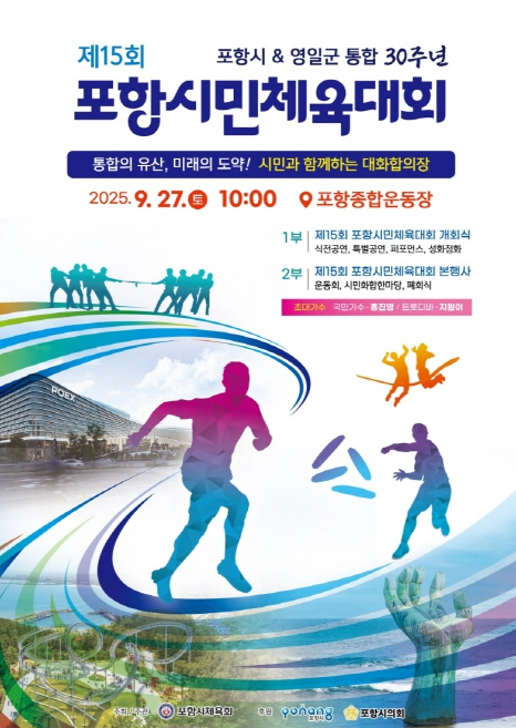 제15회 포항시민체육대회가 오는 27일 토요일 오전 10시부터 포항종합운동장에서 개최된다. 포항시체육회 주최·주관으로 열리는 이 대회는 올해 포항시와 영일군 통합 30주년을 맞아 더욱 특별한 의미로, 29개 읍면동 선수단과 시민 등 1만 명이 참여해 시민 모두가 하나되는 대화합의 장을 펼칠 예정이다. 개회식은 포항 홍보대사 가수 유연주와 풍물놀이패의 신나는 무대로 시작되며, 이어 DJ로빈의 진행으로 읍면동 선수단이 힘차게 입장해 분위기를 끌어올린다. 특히 관중석 중앙 특설 무대에서 통합 30주년의 상징성을 담은 성화 점화식이 열려 시민과 함께하는 감동의 순간을 만들어내며 국민가수 홍진영이 무대에 올라 현장의 열기를 더할 예정이다. 오후부터는 윷놀이, 줄다리기 등 남녀노소 누구나 즐길 수 있는 종목으로 본격적인 시민체육 대회를 진행해 시민의 중심이 되는 체육 축제로 펼쳐갈 계획이다. 이어지는 시민화합한마당에는 치열한 읍면동 예선전을 통과한 10개 팀이 무대에 올라 노래와 퍼포먼스를 선보이며 시민이 직접 만들어 가는 축제 분위기를 이어간다. 여기에 가수 선명과 지원이의 축하 공연가 이어질 예정이다. 포항시체육회 관계자는 “올해 시민체육대회는 통합 30년의 발자취를 돌아보고 미래 30년의 도약을 시민과 함께 다짐하는 자리”라며 “모든 시민이 어울려 화합과 감동을 나누는 축제가 될 수 있도록 대회 준비에 최선을 다하겠다”고 말했다.