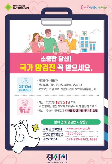 경산시는 5월 가정의 달을 맞이하여 가족의 건강을 돌아보고 건강한 삶을 지키기 위해 ‘소중한 가족 건강, 국가건강검진으로 실천하세요’라는 주제로 국가건강검진 및 국가 암검진 수검 독려 홍보를 실시한다.2025년도 국가건강검진 대상자는 20세 이상 홀수년도 출생자로 비용은 전액 무료이다. 검진 항목은 혈압, 혈당, 요단백 등 만성질환 조기 발견을 위한 공통 항목과 함께 성별 및 연령에 따라 이상 지질혈증, 간염 검사, 정신건강검사 등이 포함된다.국가 암검진 6종(위암, 간암, 대장암, 유방암, 자궁경부암, 폐암)은 20세 이상 아래와 같은 대상과 주기로 진행되며, 의료급여수급권자 및 건강보험료 하위 50% 대상자는 무료로 받을 수 있다.우리나라 사망원인 1위인 ‘암’중에서도 흔하게 발생하는 6대암은 비교적 간단한 방법으로 암을 조기에 발견할 수 있으며, 조기에 발견하여 치료할 경우 90%이상 완치가 가능하여 이로 인한 사망률을 효과적으로 낮출 수 있다.우리 시의 주요 암 연령표준화 발생률(2016-2022년/10만명당)은 위암 60.2명, 대장암 60.7명, 폐암 61.8명, 간암 30.4명, 유방암 45명, 자궁경부암 7.7명으로 나타났으며, 특히 대장암은 지속적으로 높은 발생률을 보여 정기적인 국가 암검진을 통한 조기 발견이 매우 중요하다.또한, 국가 암검진을 통해 암 진단을 받은 대상자 중 건강보험가입자(하위 50% 이하)와 의료급여수급권자 및 차상위 본인부담 경감대상자에게는 최대 300만 원의 의료비가 지원된다.경산시는 시민들의 조기 수검을 독려하기 위해 ▲ SNS 홍보 및 시청 홈페이지 게시 ▲ 행정복지센터, 보건지소·진료소 분변통 비치 ▲ 전광판 송출 및 안내 ▲ 검진대상자 유선 및 문자 안내 등 다양한 채널을 통해 검진을 독려하고 있다.안병숙 보건소장은 “2024년 기준 우리 시 국가 암검진 수검률은 36.84%이며, 대장암 검진율은 23.5%로 여전히 낮은 수준이다. 검진은 건강할 때 받는 것이 가장 효과적인 예방책인 만큼 연말보다 여유 있는 상반기 중에 검진을 받아주시기를 바란다”고 당부했다.