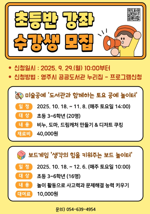 영주하망도서관은 지역 아동의 창의력과 사고력 향상을 위해 오는 29일부터 초등학생 대상 문화강좌 수강생을 모집한다.이번 강좌는 초등학교 3학년부터 6학년을 대상으로 하며, 10월 18일부터 12월 6일까지 운영된다. 교육은 △미술 공예 ‘도서관과 함께하는 토요 공예 놀이터’ △보드게임 ‘생각의 힘을 키워주는 보드 놀이터’ 등 2개 프로그램으로 구성됐다.‘미술 공예’는 다양한 공예 체험을 통해 자신의 감정을 자유롭게 표현하는 과정으로, 매주 토요일 오후 2시에 운영되며, ‘보드게임’은 놀이를 통해 협동심과 문제해결 능력을 기르는 강좌로, 매주 토요일 오전 10시에 운영된다. 모든 강좌는 무료이며, 재료비는 본인 부담이다.수강 신청은 오는 29일 오전 10시부터 영주시 공공도서관 누리집에서 선착순 접수할 수 있다. 강좌별 운영 기간 등 자세한 사항은 누리집을 참고하거나 선비인재양성과)로 문의하면 된다.김호정 선비인재양성과장은 “다양한 체험 중심의 강좌를 통해 어린이들의 창의성과 사고력을 키울 수 있는 기회가 되기를 바란다”며 “앞으로도 다양한 프로그램을 통해 아이들이 즐겁고 건강하게 성장할 수 있도록 노력하겠다”고 말했다.