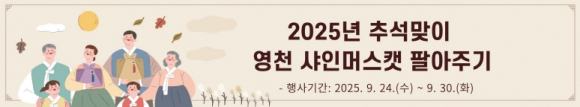 전국 최대 과일 주산지인 영천시가 추석을 맞아 24일부터 30일까지 ‘영천 샤인머스캣 팔아주기’ 행사를 개최한다고 밝혔다.이번 행사는 최근 가격 하락으로 판매에 어려움을 겪고 있는 지역 농가를 돕기 위해 마련됐으며, 영천시청과 대구 혁신도시 내 공공기관을 대상으로 기관별 주문을 받아 직접 전달하는 방식으로 행사를 진행된다.앞서 시는 본격적인 출하시기를 맞아 지난 17일부터 21일까지 5일간 농협 하나로마트 전 지점에서 ‘영천 샤인머스캣 전국 동시 판매행사’를 열고, 1.5kg 박스 2만 상자(총 30t)를 판매해 대도시 소비자들의 큰 호응을 얻은 바 있다. 오는 10월에도 전국 롯데마트 107개점, 롯데슈퍼 208개점, 전국 이마트 132개점 등 대형 유통 마트에서 전국 동시 판매행사를 이어가 지역 농가의 안정적인 판매 기반을 마련하고, 소비시장 확대에도 힘쓸 계획이다. 시 관계자는 “전국적인 재배면적 증가, 조기수확, 이상기온 등으로 샤인머스캣 가격이 전년 대비 낮게 형성되고 있다”며, “출하 농가에서는 숙기와 품질을 철저히 지켜 출하해 줄 것”을 당부했다.최기문 시장은 “판매에 어려움을 겪고 있는 지역 농가에 힘을 보태고, 영천 샤인머스캣의 우수성을 홍보하고자 이번 행사를 마련했다”며 “앞으로도 다양한 유통망 개척에 힘써 농가의 안정적인 판로 확보와 소득 향상을 위해 최선을 다하겠다”고 말했다.