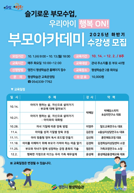 영천시 평생학습관(관장 정경자)은 부모의 양육 역량 강화를 위한 ‘2025년 하반기 부모아카데미’ 수강생을 10월 1일부터 13일까지 모집한다고 밝혔다.‘부모아카데미’는 부모들에게 실질적인 육아 노하우를 제공하고 양육 과정에서의 고민을 나누며 효과적으로 해소할 수 있도록 돕는 프로그램으로, 건강하고 바람직한 가족문화 형성에 기여할 것으로 기대된다.이번 특강은 ▲자녀 기질에 따른 양육 방법 ▲아이 맞춤형 영어 독서 로드맵 만들기 ▲부모와 자녀가 함께 성장하는 긍정 훈육의 기술 등 육아와 관련된 다양한 주제로 총 8회에 걸쳐 진행된다.영천시에 주소를 둔 부모라면 참여할 수 있으며, 모집 기간 내 평생학습관 홈페이지를 통해 선착순 40명을 접수받는다. 강의는 10월 14일부터 12월 2일까지 매주 화요일 오전 10시부터 2시간 동안 평생학습관 회의실에서 운영된다.기타 자세한 사항은 영천시 평생학습관 홈페이지를` 참고하거나, 평생학습관 교육운영팀으로 문의하면 된다.