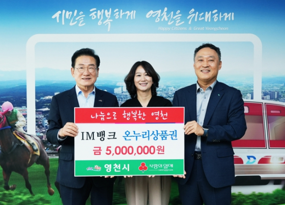 영천시는 26일 iM뱅크에서 민족 최대 명절인 추석을 맞아 지역 내 어려운 이웃들을 위해 온누리상품권 500만원을 기탁했다고 밝혔다.이날 시장실에서 열린 기탁식에는 강구석 iM뱅크 영천지점장이 참석해 온누리상품권을 직접 전달하며, 지역의 어려운 이웃을 위한 따뜻한 나눔을 실천했다.이번에 기탁된 온누리상품권은 지역 내 저소득 50가구에 가구당 10만원씩 전달될 예정이다. 명절을 앞두고 생활에 어려움을 겪는 이웃들에게 실질적인 도움을 주는 동시에, 전통시장과 지역 상권에서 사용 가능해 지역경제 활성화에도 기여할 것으로 기대된다.iM금융그룹은 지난 8월 ‘경북사랑 봉사캠프’를 열어 지역사회에 의미 있는 나눔을 실천했으며, 이 밖에도 ‘급여1%사랑나눔’ 기부, ‘iM동행봉사단’, ‘iM금융교육봉사단’ 활동을 통해 전국적으로 이웃사랑을 이어가고 있다. 강구석 지점장은 “추석 명절을 맞아 어려운 이웃들에게 따뜻한 마음이 전해지길 바란다”며, “앞으로도 지역사회와 함께하는 다양한 사회공헌 활동을 지속적으로 펼쳐가겠다”고 밝혔다.최기문 영천시장은 “iM뱅크의 따뜻한 나눔이 지역의 소외된 이웃들에게 큰 힘과 희망이 될 것”이라며, “시민 모두가 행복한 추석을 보낼 수 있도록 최선을 다하겠다”고 말했다.