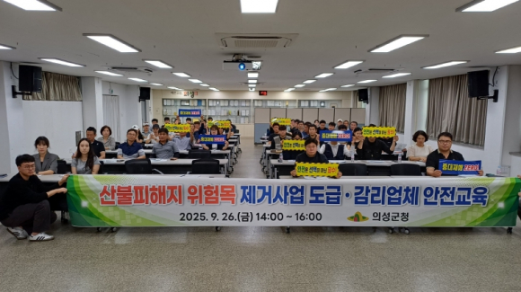 의성군은 지난 26일 의성군청 대회의실에서 산림사업법인, 산림기술엔지니어링, 관계 공무원을 대상으로 ‘산불피해지 위험목 제거사업 특별 안전교육’을 실시했다.의성군은 지난 3월 22일 발생한 대형 산불 피해 복구를 위해 우기 전 긴급 벌채 37ha와 응급 사방 공사 81개소를 완료했으며, 현재는 산불피해지 위험목 제거사업 343ha와 사방사업 42개소를 추진하는 등 산림 복구사업을 다방면으로 추진하고 있다.이번 교육은 산림사업의 안전을 위해 특별 교육을 실시하게 됐으며, 산림분야 시공사 42개, 산림 엔지니어링 14개, 관계 공무원 6명 등 다분야 관계자가 참석했다.특히 한국산업안전보건공단과 협조해 전문 강사를 초빙하여 진행된 교육은 ▲안전 체크리스트 중점교육 ▲사고사례 공유 ▲안전한 작업을 위한 준비 사항 ▲사고 발생 시 긴급 대응 절차 ▲중대재해처벌법 관련 유의 사항 등 현장에서 바로 활용할 수 있는 실무 중심 내용으로 구성됐다. 김주수 의성군수는 “벌목작업에서 안전사고를 예방하기 위해서는 철저한 안전보건 관리가 핵심”이라며, “이번 교육을 계기로 산불피해지 복구사업 참여자 모두가 안전의식을 높여 더욱 안전한 복구사업을 추진해 나가겠다”고 말했다.