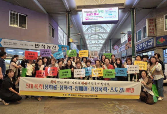 봉화군은 추설 명절을 앞두고 지난 9월 29일 억지춘양시장 일대에서 봉화군여성단체협의회 회원 40여 명과 함께 5대 폭력 예방캠페인을 진행했다.이번 캠페인은 ‘사라지는 폭력, 살아나는 인권 존중’이라는 슬로건 아래 지역사회 안전문화 확산을 위해 진행됐으며, 참가자들은 시장 이용객들에게 5대 폭력(성희롱, 성매매, 성폭력, 가정폭력, 스토킹) 예방 및 여성폭력 추방주간에 대한 홍보물 배포와 피켓과 현수막을 활용한 가두행진을 펼쳤다.봉화군은 이번 행사를 통해 지역사회 내에서 폭력 예방과 인권 존중에 대한 인식을 높이고. 주변의 어려움을 살피는 계기가 되기를 기대하고 있다.한편, 봉화군은 매년 지역주민 및 단체와의 협력을 통해 폭력 없는 환경을 조성하기 위해 캠페인과 교육 등 다양한 예방 활동을 펼치고 있다.