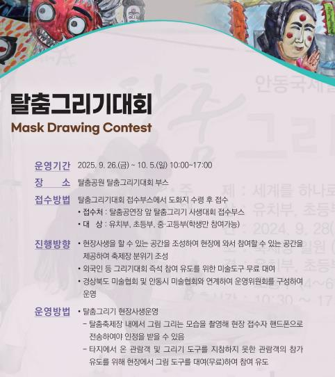 2025 안동국제탈춤페스티벌에서는 축제 기간 동안 세계탈춤그리기대회가 운영된다. 이번 대회는 어린이와 청소년들이 탈춤을 직접 그려보며 축제를 경험하고, 전통문화를 창의적인 시각으로 재해석할 수 있도록 마련된 프로그램이다.참가 신청은 축제 기간 중 대회 부스에서 상시 가능하며, 참가자들은 탈춤공원과 공연장에서 만난 장면, 해외 공연단의 다채로운 무대, 가족과 함께 즐긴 축제 풍경 등을 자유롭게 화폭에 담을 수 있다. 완성된 작품은 축제 사무국에 제출하면 심사를 거쳐 입상작이 선정된다.현장에서 제공되는 도화지에 자유롭게 그림을 완성해 제출하면 되며, 즉석에서 참여하는 참가자에게는 미술도구를 무료로 대여한다. 다만 현장 사생이므로, 축제장 내에서 그림 그리는 모습을 촬영해 현장 접수자 핸드폰으로 전송해야 인정받을 수 있다.안동시는 “세계탈춤그리기대회는 어린이와 청소년이 축제를 함께 만들어 가는 주인공이 되는 기회”라며 “아이들의 창의적인 시선 속에서 탈춤의 새로운 가치를 발견할 수 있을 것”이라고 밝혔다.