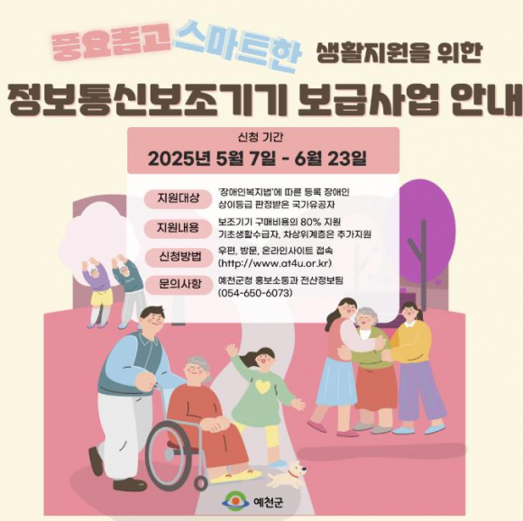 예천군은 정보 취약계층의 디지털 접근성 향상을 위해 2025년 정보통신보조기기 보급사업을 시행한다.정보통신보조기기 보급사업은 한국지능정보사회진흥원(NIA)에서 주관하여 계층 간 정보 격차 해소를 위해 매년 추진하는 사업으로,신청 자격은 `장애인복지법`에 따라 등록된 장애인과 `국가유공자 등 예우 및 지원에 관한 법률`에 따라 등록된 자 중 상이등급 판정을 받은 자이다.보급대상자로 선정되면 보조기기 제품 가격의 80%를 정부에서 지원하며, 나머지 20%는 개인이 부담한다. 특히, 기초생활수급자 및 차상위계층 장애인은 개인부담금의 50%를 추가로 지원받을 수 있다.신청 기간은 5월 7일부터 6월 23일까지이며, 신청자는 정보통신보조기기 홈페이지에서 직접 신청하거나 신청서와 구비서류를 예천군청 홍보소통과나 한국지능정보사회진흥원으로 방문 또는 우편 제출하면 되고, 서류심사 및 심층면접을 통해 최종 보급자를 선정한다.김기정 홍보소통과장은 “정보 접근에 어려움을 겪는 군민들에게 정보통신보조기기를 지원하여 정보 이용의 편의를 높이고, 나아가 사회 참여 기회를 확대할 수 있도록 노력하겠다”고 전했다.