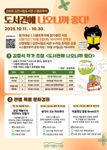 김천시립도서관(관장 이신기)은 오는 10월 11일부터 30일까지 도서관 스탬프투어 프로그램 `도서관에 나오니까 좋다`를 운영한다고 밝혔다. 이번 프로그램은 김천시립도서관 본관을 비롯해 율곡도서관, 자두꽃·보랏빛꿈·푸름찬·김산고을 작은도서관 등 관내 6개 도서관에서 진행된다. 먼저 김중석 작가와 어린이 독자의 만남을 통해 작가의 저서 『나오니까 좋다』를 함께 읽고 일상의 작은 행복을 나누며 책과 그림으로 소통하는 시간이 마련되어 있다. 김 작가의 주요 작품으로는 제5회 보림창작그림책 공모전에서 우수상을 받은 『아빠가 보고 싶어』를 비롯해 『그리니까 좋다』, 『잘 그리지도 못하면서』, 『열매가 톡!』 등이 있다. 아울러 3주간 ▲상상 책놀이 & 천연비누 만들기 ▲생각이 크는 하브루타 ▲마음챙김 힐링 북요가 등 특별 문화 강좌도 운영된다. 이신기 시립도서관장은 “어린이부터 성인까지 즐겁게 이용할 수 있는 도서관을 만들기 위해 앞으로도 다양한 독서 문화 프로그램을 운영하겠다.”라고 전했다. 참여 신청은 10월 2일 오전 10시부터 도서관 누리집에서 가능하며, 자세한 내용은 공지 사항을 참고하거나 시립도서관으로 문의하면 된다.