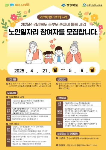 영천시는 21일부터 5월 9일까지 ‘2025년 조부모 손자녀 돌봄사업’ 참여자 40명을 모집한다고 밝혔다.이 사업은 돌봄이 필요한 취약가정의 10세 이하 아동을 대상으로 (외)조부모가 등 · 하원, 보육, 교육, 놀이 등을 지원하는 노인일자리 사업으로, 2025년 5월부터 10월까지 5개월간 운영된다.참여 자격은 영천시에 거주하는 만 60세 이상 (외)조부모이며, 서비스 대상자는 경상북도에 거주하는 10세 이하 아동을 양육하는 맞벌이, 다자녀, 한부모, 장애부모, 다문화 가정 등 양육 공백이 있는 가정이다. 단, 서비스 대상아동이 부모급여를 받거나, 유사 돌봄서비스를 이용 중인 가정은 대상에서 제외된다.신청은 영천시니어클럽에 직접 방문해 접수해야 하며, 참여자 선정은 서비스 대상 가정의 소득수준과 돌봄 필요도, 참여자의 역량 등을 종합적으로 평가해 이루어진다.최기문 영천시장은 “조부모 손자녀 돌봄사업은 고령화와 양육 부담이라는 두 가지 사회적 문제를 동시에 해결할 수 있는 의미 있는 사업”이라며, “앞으로도 어르신들이 역량을 발휘할 수 있는 다양한 일자리를 지속적으로 확대해 나가겠다”고 말했다.