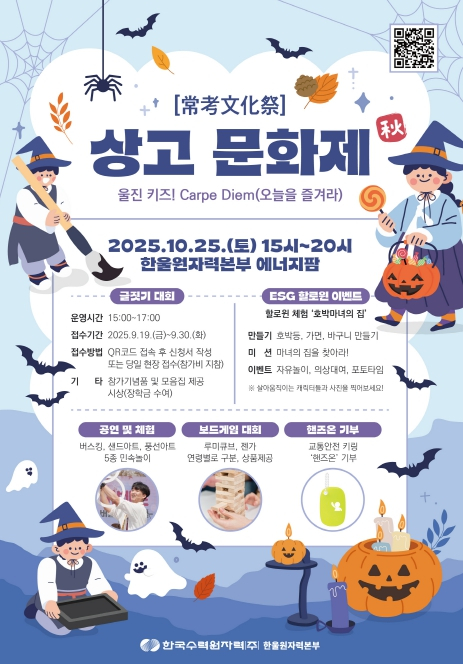 한국수력원자력(주) 한울원자력본부)는 10월 25일 15시 한울에너지팜에서 제2회 ‘한울 상고문화제 가을(秋)편’ `울진 키즈! Carpe Diem(오늘을 즐겨라)`를 개최한다. ‘항상 상(常), 생각할 고(考)’라는 이름처럼 아이들이 스스로 생각하는 힘을 기르라는 뜻으로 기획된 상고문화제는 春편(사생대회)에 이어 글짓기와 ESG 할로윈 체험, 보드게임 대회 등으로 준비됐다. 글짓기 대회는 울진관내 초등학생이라면 누구나 참가할 수 있고 제출된 작품은 추후 모음집으로 발간하고 한울에너지팜에 전시될 예정이다. ESG 할로윈 체험은 아이들이 코스튬 착장 후 입장시 기념품을 증정하고, 대여도 가능하며 컨셉미션, 캐릭터 그리팅, 만들기 부스를 통해 할로윈 문화를 몸소 체험할 수 있다. 보드게임 대회는 학생부와 일반부로 나누어 토너먼트 방식으로 진행되며 승자에게는 상품도 수여한다. 아이들을 위한 교통사고 예방용품으로 활용 가능한 교통안전 키링 만들기를 통해 기부도 할 예정이다. 이외에도 풍선아트, 샌드아트, 버스킹 등 다양한 컨텐츠로 쌀쌀해진 날씨에 온기를 더할 것이다. 이세용 본부장은 “이날 하루 다양한 컨텐츠를 누리는 아이들이 온전히 주인공이 되길 바라며, 항상 문과 예를 통해 생각하는 힘을 기를수 있는 기회를 제공함에 최선을 다하겠다.” 라고 말했다. 자세한 내용은 한울본부 인스타그램을 참고하거나 한울본부 홍보부로 문의하면 확인할 수 있다. 끝.