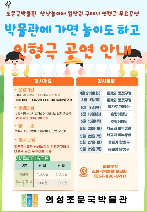 의성군 조문국박물관은 봄철 육아보육기관의 현장학습이 활발해짐에 따라, 유치원 및 어린이집 아동을 위한 인형극 프로그램 『박물관에 가면 놀이도 하고』를 운영한다고 밝혔다. 이 프로그램은 박물관 관람과 함께 놀이와 인형극 체험을 함께 즐길 수 있도록 구성되어 있다. 특히, 창의력과 상상력을 자극하는 콘텐츠로 문화 공간에서의 놀이학습 기회를 제공할 예정이다. 『2025년 박물관에 가면 놀이도 하고』는 올해 처음으로 시행되는 프로그램으로 5월 29일까지 매주 화요일과 목요일에 운영된다.(공휴일 제외) 참여 대상은 의성조문국박물관 상상놀이터 입장권을 구매한 단체방문객이며, 놀이체험은 1층 모험의성(에어포켓, 정글짐 등), 인형극은 2층 북카페에서 무료로 진행된다. 참여를 원하는 기관은 사전 전화 신청을 통해 예약할 수 있으며, 입장권 요금은 관내 어린이 1,000원, 관외 어린이 2,000원이다.김주수 의성군수는 “올해 처음으로 선보이는 인형극 프로그램을 통해 어린이들이 놀이와 문화체험을 동시에 즐기며, 창의력과 상상력을 키울 수 있길 바란다”라며, “앞으로도 아이들이 즐겁고 행복한 시간을 보낼 수 있는 다양한 프로그램을 지속적으로 마련해, 꿈과 상상력이 자라는 따뜻한 문화 공간으로 발전시켜 나가겠다.”라고 말했다.