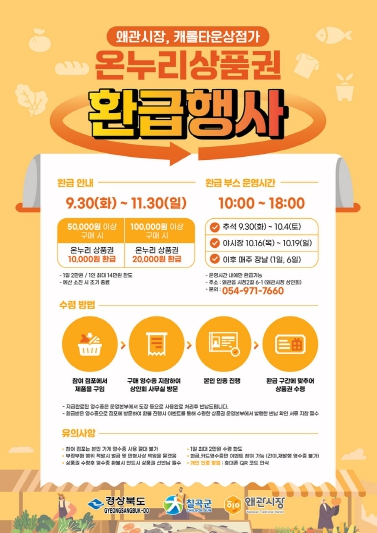 칠곡군은 전통시장 활성화와 지역경제 활력 제고를 위해 9월 30일(화)부터 11월 30일(일)까지 전통시장 구매 고객을 대상으로 온누리상품권 환급행사를 진행한다.이번 행사는 행사 기간 중 왜관시장과 캐롤타운상점가의 참여 점포에서 일정 금액 이상을 구매한 고객에게 구매 금액에 따라 온누리상품권을 환급해 주는 방식으로 진행된다.▶ 5만 원 이상 구매 시 1만 원 상품권 환급▶ 10만 원 이상 구매 시 2만 원 상품권 환급환급 부스는 행사 기간 중 오전 10시부터 오후 6시까지 운영되며, ▲추석맞이 특별환급(9월 30일 ~ 10월 4일), ▲칠곡낙동강축제 특별환급(10월 16일 ~ 10월 19일), ▲이후 매주 장날(1일, 6일)에 진행된다.칠곡군 관계자는 “이번 행사는 코로나 이후 침체된 지역 상권에 활력을 불어넣고, 대경선 개통에 따른 지역경제활성화를 위해 마련됐다”며 “많은 군민과 지역방문객들이 참여해 전통시장의 따뜻한 정과 혜택을 함께 누리길 바란다”고 전했다.
