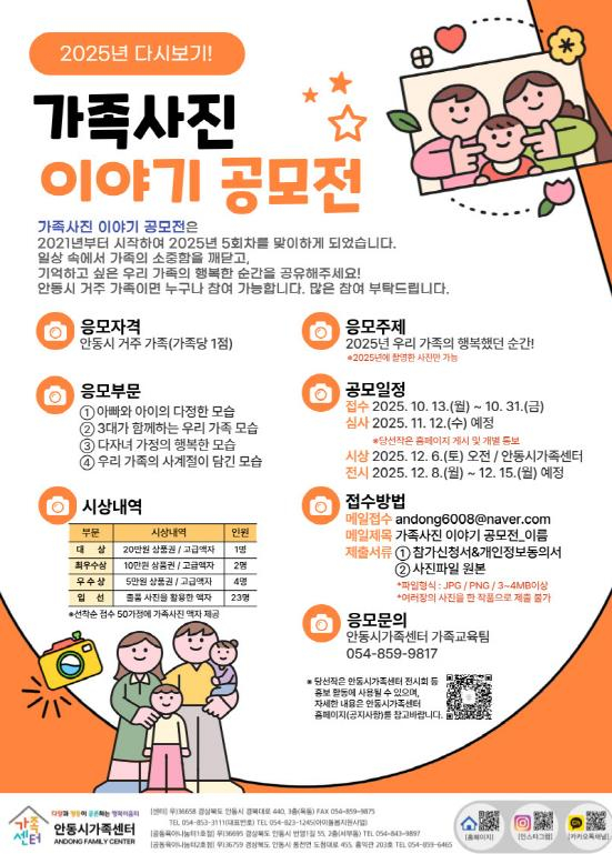 안동시는 가족의 소중한 추억을 되새기기 위한 『2025년 다시보기! 가족사진 이야기 공모전』을 개최한다.이번 공모전은 가족 친화적 문화 정착과 가족 건강성 증진을 위한 일․가정 양립 지원 사업의 일환으로, 안동시가족센터의 대표 프로그램으로 자리매김하고 있다. 2021년 처음 시작된 이후 올해 5회차를 맞은 이번 공모전은 ‘2025년 우리 가족의 행복했던 순간!’을 주제로 안동시에 거주하는 모든 가족이 참여할 수 있다. 접수 기간은 10월 13일부터 10월 31일까지다. 접수된 작품은 내부 심사를 거쳐 12월 6일 시상식을 진행할 예정이며, 12월 8일부터 12월 15일까지 안동시립박물관 별관전시관에서 전시된다.이은주 보육아동가족과장은 “가족은 우리 삶의 뿌리이자 어려움 속에서도 서로를 지탱해 주는 가장 든든한 울타리”라며 “이번 공모전을 통해 소중한 가족의 의미를 다시금 되새기고 감사함을 느끼는 시간이 되길 바란다”고 전했다.유하영 안동시가족센터장은 “안동시가족센터가 지역 내 가족들과 한 걸음 더 가까이 다가갈 수 있는 한해였다. ‘2025년 다시보기! 가족사진 이야기 공모전’을 통해 가족의 소중함을 깨닫고 진정한 가족의 의미를 되새기는 발판이 되길 바란다”고 말했다.
