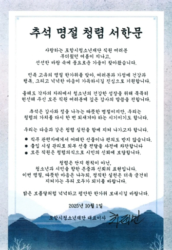 포항시청소년재단은 추석 명절을 맞아 전 임직원에게 ‘청렴 서한문’을 전달하며 공정하고 투명한 조직문화 조성을 위한 실천 의지를 다졌다.이번 청렴 서한문에는 “추석은 감사와 정을 나누는 따뜻한 명절이지만, 동시에 청렴의 가치를 다시금 되새겨야 하는 시기”라는 메시지가 담겼다.명절 분위기 속에서도 공직자로서의 책무와 윤리를 잊지 말자는 뜻을 전하며, 청렴이 조직의 신뢰와 시민 존중의 기본임을 강조했다.최제민 포항시청소년재단 대표이사는 서한문에서 “청렴은 단지 규범이 아니라 청소년과 시민에 대한 신뢰의 약속이자 존중의 표현”이라며, “이번 명절이 공직자의 청렴 의식을 되새기고, 투명한 행정을 실천하는 계기가 되길 바란다”고 전했다.포항시청소년재단은 앞으로도 청렴 교육과 부패 예방 활동을 지속 강화해 청소년과 시민이 신뢰할 수 있는 공공기관으로서의 책임을 다해 나갈 계획이다.