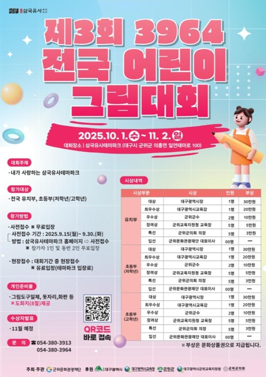 군위문화관광재단은 10월 1일부터 11월 2일까지 한달 간 삼국유사테마파크에서 `제3회 3964 전국 어린이 그림대회`를 진행하고 있다. 이번 대회는 전국의 유치부(만 3세이상), 초등부(저학년/고학년)를 대상으로 하며, 참가 어린이들은 대회 기간 중 삼국유사테마파크를 방문해 현장접수 후 그림을 그려 제출하면 된다. 현장에서 제공되는 8절 도화지에 자유 형식으로 참여할 수 있으며, 그림도구와 화판, 돗자리 등 필요한 준비물은 개별 지참해야 한다. 대회의 주제는‘내가 사랑하는 삼국유사테마파크’로, 어린이들의 자유로운 상상력과 시각을 통해 지역 문화와 삼국유사의 역사적 가치를 표현할 수 있는 기회를 제공한다. 수상작은 전문가 심사를 거쳐 오는 11월 중 발표되며, 시상식도 함께 열릴 예정이다. 입상작은 12월 삼국유사배움터 화본마을 작은미술관에서 전시된다. 또한, 대회 기간 중 11월 1~2일에는 `2025 군위 바베큐 축제`도 함께 열려, 참가 가족들이 그림대회와 축제를 동시에 즐길 수 있다. 군위문화관광재단 관계자는 “올해로 3회째를 맞는 이번 대회가 전국 어린이들의 창의성과 표현력을 발휘하는 장이 되기를 기대한다”며, “지역의 문화적 가치를 높이고 군위를 대표하는 문화행사로 발전시켜 나가겠다”라고 밝혔다. 자세한 문의는 군위문화관광재단 으로 하면 된다.
