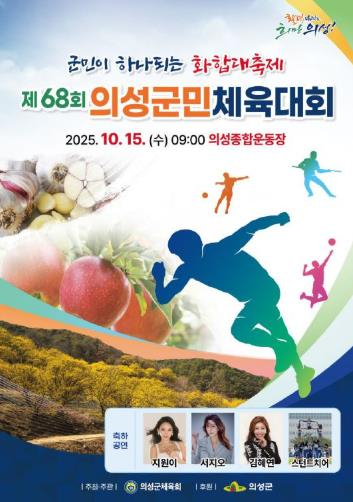 의성군은 의성군민의 대화합 한마당 축제인 ‘제68회 의성군민체육대회’가 오는 10월 15일 의성종합운동장에서 개최된다고 밝혔다.의성군과 의성군체육회에 따르면 이번 군민체육대회는 승부보다 군민 간 소통과 화합에 중점을 두고 추진되며, 군민이 함께 즐기고 참여하는 축제의 장으로 꾸며진다. 1부 개회식은 선수단 입장을 시작으로 ▲개회선언 ▲대회사 ▲격려사 및 축사 ▲축하공연 순으로 진행된다. 특히, 스턴트 치어리딩팀 ‘빅타이드’와 인기가수 지원이의 무대가 준비되어 의성군민의 자긍심과 애향심을 고취하는 화합의 장이 될 것으로 기대된다.2부 체육대회는 18개 읍면 선수단이 참여하여, 오징어게임·한마음협동배구·줄다리기·단체줄넘기 등 6개 종목별 경기를 통해 각 읍면의 단합된 힘과 열정을 선보이게 된다. 이어지는 3부 폐회식에서는 종합 우승 시상식과 함께 인기가수 서지오, 김혜연의 축하공연이 펼쳐져 군민 모두가 하나로 어우러지는 진정한 화합의 무대를 완성할 예정이다. 이외에도 선수단과 관람객을 위한 다채로운 먹거리와 체험 프로그램이 운영되어, 문화와 체육이 어우러지는 군민 축제의 장이 될 것으로 기대된다.김주수 의성군수는 “이번 체육대회는 군민 모두가 함께 즐기고 화합하는 뜻깊은 자리”라며 “바쁜 일상 속에서 스트레스를 풀고, 하나 된 마음으로 의성의 활력을 느낄 수 있는 소중한 시간이 되길 바란다”고 말했다.