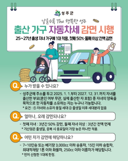 성주군은 13일 올해를 포함해 2027년까지 자녀를 출산한 가구를 대상으로 자동차세를 50%(둘째 자녀 이상 전액) 감면한다고 밝혔다. 이 같은 내용을 담은 군세 감면 조례 개정안이 최근 성주군 의회를 통과해 2025년 제1기분 자동차세 부과분부터 적용된다. 대상은 성주군에 주소를 두고 25년부터 27년까지 자녀를 출산한 부모로서, 자동차 소유자인 부모와 출생 자녀는 출생일로부터 3년이 되는 날까지 주민등록표상 동일 세대를 계속 유지하여야 한다. 대상 자동차는 배기량 3,000cc 이하 또는 7~10인승 승용차, 15인승 이하 승합차, 1톤 이하 화물차, 250cc 이하 이륜차 가운데 먼저 감면을 신청한 1대에 한정된다.군은 “이번 자동차세 감면 조례는 출산·양육 가정의 세제 부담을 크게 덜어줄 뿐 아니라, 출산을 장려하는 데 중요한 역할을 할 것이라며, 앞으로도 ‘낳을수록 The 행복한 성주’를 만들기 위해 다양한 정책을 시행하고 문화를 확산시켜 나가겠다.”고 밝혔다.신청은 군청 재무과 부과팀 또는 읍․면 행정복지센터로 문의하면 된다.
