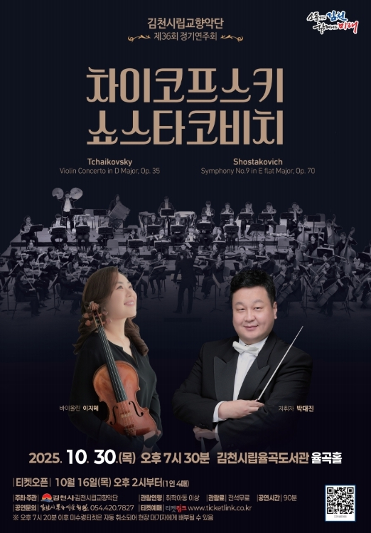 김천시문화예술회관은 10월 30일 목요일 오후 7시 30분에 시립율곡도서관 2층 율곡홀에서 시립교향악단 제36회 정기연주회를 개최한다. 이번 정기연주회에서는 동양인 여성 최초로 독일 바이에른 방송 교향악단 제2바이올린 악장에 임명되어 화제를 모은 바이올리니스트 이지혜가 차이코프스키 바이올린 협주곡을 연주하고, 쇼스타코비치 서거 50주년을 기념하여 쇼스타코비치의 원숙하고 세련된 음악성을 엿볼 수 있는 교향곡 제9번을 연주하여 시민들에게 밝은 희망의 멜로디를 전달할 예정이다. 공연 시간은 중간 휴식 시간 포함하여 약 1시간 30분 정도이며, 취학아동 이상 전석 무료로 관람 가능하다. 사전예매는 10월 16일 목요일 오후 2시부터 티켓링크 누리집 및 앱을 통해 진행되며, 1인당 최대 4매까지 예매가 가능하다. 예매한 티켓은 공연 당일 오후 6시 30분부터 현장에서 예매권 확인 후 배부한다. 다만, 공연 시작 10분 전까지 좌석권 미수령 시 해당 예매는 자동 취소되어 현장 대기자에게 배부하므로 주의가 필요하다. 자세한 사항은 김천시 문화예술회관 누리집 공지사항을 확인하거나, 문화예술회관 사무실로 문의하면 된다.