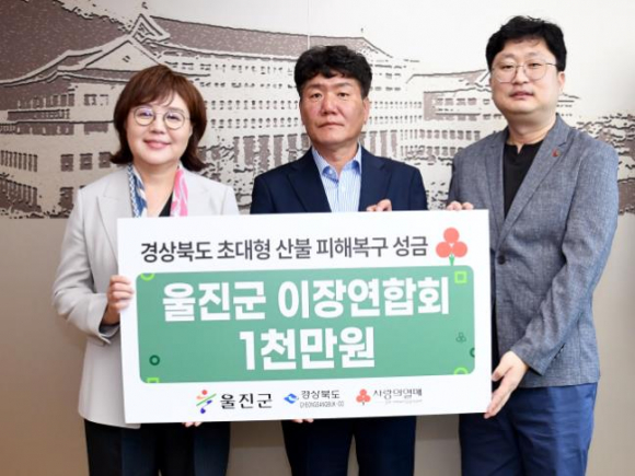 울진군이장연합회는 지난 4월 18일 경북도청에서 초대형 산불 피해 복구를 위한 성금 1천만 원을 경상북도 사회복지공동모금회(사랑의열매 경북모금회)에 기탁했다고 밝혔다. 이번 성금은 울진군 관내 195개 리의 이장들이 자발적으로 모금한 것으로, 산불 피해로 생활 터전을 잃은 주민들의 신속한 일상 회복과 피해복구 지원을 위해 마련됐다. 기탁식에는 장동윤 울진군이장연합회장과 양금희 경상북도 경제부지사 등이 참석했으며, 기탁된 성금은 경북사회복지공동모금회를 통해 피해 지역의 복구와 이재민 지원사업 등에 사용될 예정이다. 장동윤 울진군이장연합회장은“2022년 울진산불 당시 전국 각지에서 보내준 따뜻한 손길을 잊지 않고 있다”며“이제는 울진군 이장들이 먼저 나서 도울 차례라는 마음으로 성금을 마련했고 앞으로도 피해지역 주민들의 조속한 일상회복 지원을 위한 활동에 앞장서겠다”라고 밝혔다.