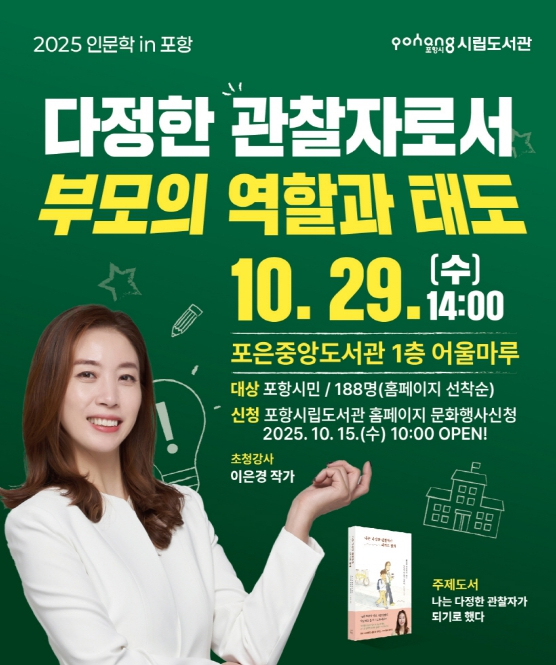 포항시립도서관은 10월 문화가 있는 날을 맞아 오는 29일 오후 2시, 포은중앙도서관 1층 어울마루에서 ‘인문학 in 포항’의 마지막 강연자로 이은경 작가를 초청해 강연을 진행한다. ‘인문학 in 포항’은 3월부터 10월까지 매달 마지막 주 수요일, 각 분야의 명사를 초청해 다양한 주제로 진행되는 포항시립도서관의 대표 인문 프로그램이다. 매회 높은 시민 호응을 얻으며 포항의 대표 문화강연으로 자리 잡았다. 이번 강연의 연사인 이은경 작가는 15년간 초등학교 교사로 재직했으며, 두 아들의 엄마로서 20년 가까이 쌓아온 교육 경험과 노하우를 바탕으로 부모와 자녀가 함께 성장하는 교육법을 전하고 있다. 지난 7년간 초등공부, 학교생활, 부모성장을 주제로 한 강연을 유튜브와 네이버 오디오 클립에 공유하며 초등 엄마들의 든든한 멘토가 됐다. 현재 ‘슬기로운 초등생활’이라는 이름의 유튜브 채널인 초등 교육 대표 콘텐츠의 운영자이며, 주요 저서로 ‘초등 자기주도 공부법’. ‘초등 매일 공부의 힘’. ‘나는 다정한 관찰자가 되기로 했다’ 등이 있다. 이번 강연의 주제는 ‘다정한 관찰자로서 부모의 역할과 태도’로 비교, 경쟁의 시대 속 부모의 역할과 다정한 관찰을 위한 부모의 태도에 대해 이야기 나눌 예정이다. 이번 행사는 시립도서관 홈페이지 문화행사신청 코너에서 15일 오전 10시부터 사전접수 받으며, 자세한 사항은 시립도서관 홈페이지를 참고하거나 포은중앙도서관으로 문의하면 된다.