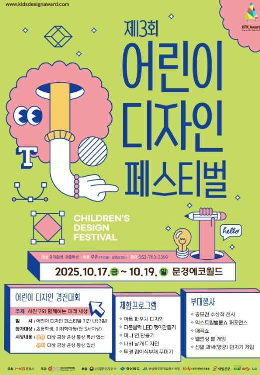 경상북도와 문경시가 주최하고 (사)디자인정책연구원이 주관하는 제13회 대한민국 어린이제품 디자인 공모전 ‘어린이 디자인 페스티벌’이 10월 17일부터 19일까지 사흘간 문경에코월드에서 열린다. ‘어린이 디자인 페스티벌’은 어린이들의 창의적 사고를 촉진하고 숨겨진 능력을 발굴할 수 있도록 어린이 디자인 경진대회, 디자인으로 즐기는 체험활동, 마술쇼, 익스트림 벌룬쇼 퍼포먼스, 작품 전시 등 다채로운 부대행사가 펼쳐지며 문경에코월드 입장객은 무료로 참여할 수 있다. 제13회 대한민국 어린이 제품 디자인공모전은 7월부터 어린이 제품, 시각, 환경 분야의 디자인을 주제로 진행됐으며, 총 127팀이 참가했다. 디자인 전문위원의 엄정한 심사를 거쳐 대상(산업통상자원부장관상) 1팀, 금상(경상북도지사상) 1팀, 은상(문경시장상) 2팀, 동상(한국디자인진흥원장상 외) 3팀 등 총 7개 팀이 수상작으로 선정됐다. 시상식은 10월 17일 오후 2시 문경에코월드 행사장 무대에서 수상 작품 전시와 함께 진행되며, 자세한 내용은 대한민국 어린이 제품 디자인공모전 홈페이지에서 확인할 수 있다.