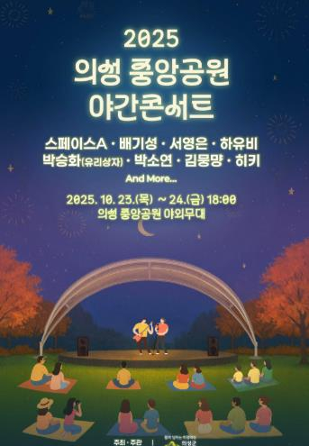 의성군은 지난 7월 1일 개원한 도심 속 힐링공간 ‘의성 중앙공원’에서 오는 23일부터 24일까지 양일간 오후 6시에 ‘2025 의성 중앙공원 야간콘서트’를 개최한다고 밝혔다. 올해 처음으로 열리는 이번 콘서트는 23일에는 김뭉먕, 뮤지컬갈라(성민재, 조환지), 박소연(크로스오버), 유리상자 박승화, 스페이스A가, 24일에는 하유비, 히키, 뮤지컬갈라(노용원, 안진영), 서영은, 배기성(CAN) 등 다양한 장르의 유명 아티스트와 지역 공연팀 총 14팀이 참여한다. 김주수 의성군수는 “이번 ‘의성 중앙공원 야간콘서트’는 다양한 세대가 함께 즐길 수 있는 문화공연으로 마련됐다”며 “앞으로 지역민과 관광객이 함께 공감하고 즐길 수 있는 지속가능한 야간 관광 콘텐츠로 확대해 나가겠다”고 말했다.이번 공연은 별도의 입장료 없이 무료로 진행된다.