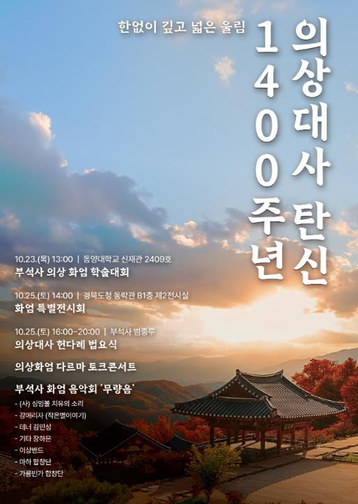 영주시는 의상대사 탄신 1400주년을 맞아 오는 23일부터 31일까지 부석사, 영주시 동양대학교, 경상북도청 동락관 전시실에서 다채로운 기념행사를 개최한다고 밝혔다.이번 행사는 우리나라 화엄종의 개조(開祖)이자 부석사 창건주인 의상대사의 탄신 1400주년을 기리는 뜻깊은 자리로, 그의 사상적 유산을 재조명하고 현대적 가치로 되새기기 위해 마련됐다.기념행사는 학문적·예술적·대중 참여형 프로그램으로 구성돼, 의상대사의 사상과 화엄정신을 다각도로 조명한다.첫 일정으로는 10월 23일 오후 1시, 동양대학교 신재관 2409호에서 ‘부석사 의상 화엄 학술대회’가 열린다. 불교학계의 저명한 학자들이 참여해 의상대사의 화엄사상과 부석사의 문화유산을 주제로 심도 있는 발표와 토론을 진행할 예정이다.이어 10월 25일 오후 2시, 경상북도청 동락관 지하 1층 제2전시실에서 ‘화엄 특별전시회’ 개막식이 열리며, 31일까지 일주일간 시민들에게 개방된다. 이번 전시에서는 의상대사와 화엄사상 관련 유물을 통해 관람객들에게 불교문화의 깊이와 미학적 가치를 선보일 계획이다.같은 날 오후 4시부터는 부석사 범종각 일원에서 ‘의상 탄신 헌다례 법요식’, ‘의상 화엄 다르마 토크콘서트’, ‘부석사 화엄 음악회 `무량음`’이 차례로 진행된다.조종근 문화예술과장은 “이번 의상대사 탄신 1400주년 기념행사는 그의 사상을 재조명하고, 화엄의 세계관을 현대적으로 해석하는 학문적·문화적 의미를 지닌 자리가 될 것”이라며 “의상대사가 창건하신 부석사에서 행사를 개최하게 되어 매우 뜻깊으며, 시민과 관광객이 함께하는 의미 있는 문화축제가 되길 바란다”고 말했다.한편, 의상대사(625~702)는 대한불교 화엄종의 개조(開祖)로, 당나라 유학을 통해 화엄사상을 확립하고 귀국 후 한국 화엄종의 기틀을 세웠다. 676년(문무왕 16년)에는 문무왕의 뜻에 따라 부석사를 창건했으며, 영주에는 부석사를 비롯해 비로사·성혈사·영전사·진월사·초암사·흑석사 등 그가 창건한 사찰이 남아 있어 화엄사상의 중심지로 자리하고 있다.