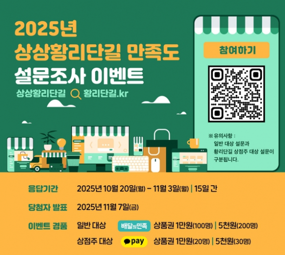 경주시는 ‘2025 상상황리단길 홈페이지 만족도 설문 조사’를 10월 20일부터 11월 3일까지 15일간 실시한다고 19일 밝혔다.상상황리단길은 과학기술정보통신부의 ‘디지털 공공서비스 혁신 프로젝트 공모 사업’을 통해 구축된 온라인 플랫폼으로, 경주의 대표 관광지인 황리단길의 골목, 상점, 포토존 등을 3D 가상공간으로 구현해 관광객 유입과 골목상권 활성화를 도모하고 있다.이번 설문은 △황리단길 방문객 및 홈페이지 이용자(시민‧관광객) △황리단길 내 상점주를 대상으로 진행되며, 이용 경험과 서비스 만족도, 개선 의견 등을 수렴해 홈페이지 운영의 품질 향상 및 운영 기초자료로 활용할 계획이다.참여 방법은 홈페이지 이벤트 참여 메뉴 또는 홍보용 QR코드 접속을 통해 가능하며, 설문을 완료한 일반인 300명과 상점주 50명을 추첨해 소정의 경품을 제공한다.경주시 관계자는 “이번 설문을 통해 이용자와 상점주의 다양한 의견을 수렴하고, 상상황리단길 홈페이지를 실질적으로 도움이 되는 지역 상권 지원 플랫폼으로 발전시켜 나가겠다”며, “시민과 관광객 여러분의 많은 참여를 바란다”고 말했다.