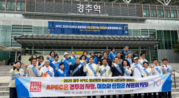 경주시 미래발전자문위원회는 21일 경주역 일대에서 2025 APEC 정상회의의 성공개최를 기원하는 시민참여 캠페인을 실시했다. 이번 캠페인은 청결하고 친절한 도시 이미지를 세계에 알리고 ‘살기 좋은 글로벌 도시, 경주’의 위상을 확산하기 위해 마련됐다.이날 위원들은 APEC 홍보물을 시민과 관광객에게 배포하며 정상회의 개최 의의와 경주의 역할을 알렸고, 경주역 주변 및 광장 일대에서 쓰레기 수거와 환경정비 활동을 펼쳐 쾌적한 도시환경 조성에 앞장섰다.또한 택시 기사와 상가 상인들을 대상으로 ‘미소와 인사’ 친절 캠페인을 진행하며 경주의 따뜻하고 밝은 이미지를 널리 전파했다.이와 함께 APEC 홍보 및 친절문화 확산 카드뉴스를 시민들에게 배포해 자발적인 참여 분위기를 이끌었다.참여자들은 “시민 한 사람의 참여가 APEC 성공의 열쇠이자, 경주의 글로벌 위상을 높이는 힘이 된다”라며, “깨끗한 환경과 친절한 미소로 세계 손님을 맞이하자”고 동참을 당부했다.