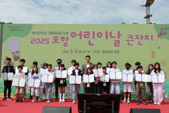 포항시는 지난 5일 환호공원 일원에서 열린 ‘2025 포항 어린이날 큰잔치’가 어린이와 가족 등 5,000여 명이 참여한 가운데 성황리에 마무리됐다고 밝혔다.올해로 103회를 맞은 어린이날을 기념해 포항시가 주최하고 경북매일신문사가 주관한 이번 행사는 ‘아이들이 행복한 키즈 프렌들리 파크’를 주제로, 온 가족이 함께 즐기는 다채로운 프로그램이 펼쳐졌다.행사는 ▲기념식과 공식 무대가 열린 드림파크 ▲연령별 놀이공간이 조성된 플레이파크 ▲체험과 안전교육이 어우러진 퍼니파크 등으로 구성돼 어린이들에게 잊지 못할 추억을 선사했다.드림파크에서는 흥겨운 싱어롱 댄스를 시작으로 아동권리헌장 낭독과 모범 어린이 시상식이 열려 의미를 더했으며, 부모와 자녀가 함께 참여하는 가족 레크리에이션도 큰 호응을 얻었다.플레이파크에는 ▲영아존(회전 컵, 공룡 바운스) ▲유아존(핸들링카, 블록 놀이터) ▲키즈존(상어 바운스, 정글랜드 슬라이드) 등 연령에 맞춘 놀이시설이 운영돼 아이들이 마음껏 뛰어놀 수 있는 공간으로 꾸며졌다.퍼니파크는 ▲경찰차 체험 ▲미아방지 사전 지문 등록 ▲소방안전홍보관 ▲해병대 전시체험 ▲이동 안전 체험교육 등 유익한 체험 활동으로 채워져 큰 인기를 끌었다.이강덕 포항시장은 “미래의 주역인 어린이들이 다양한 경험 속에서 가족과 소중한 추억을 쌓고, 포항의 밝은 미래를 이끌어갈 주인공으로 건강하게 성장하길 바란다”며 “앞으로도 어린이와 가족 모두가 행복한 도시 를 만들기 위해 문화·체험 프로그램을 지속 확대해 나가겠다”고 말했다.