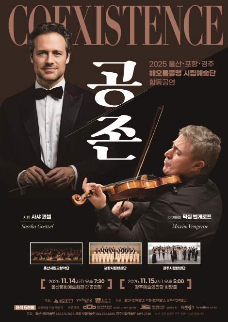 울산광역시가 주관하는 ‘2025 해오름동맹 시립예술단 합동공연 `공존(COEXISTENCE)`’이 11월 14일 울산문화예술회관 대공연장, 11월 15일 경주예술의전당 화랑홀에서 잇따라 열린다.이번 공연은 경주・울산·포항 세 도시가 함께하는 ‘해오름동맹 시립예술단 합동공연’의 일환으로, 세 도시가 매년 주관을 번갈아 맡으며 이어온 정례 문화교류 무대다. ‘해오름동맹’은 2016년 체결된 광역 협력체로, 경제·관광·문화 등 다양한 분야에서 상생 협력을 이어오고 있으며, 그중 시립예술단 합동공연은 동해안권을 하나로 잇는 대표 예술 교류 프로젝트로 자리매김했다.올해 공연의 주제는 ‘공존(共存)’으로, 도시와 예술, 사람과 사람의 화합을 의미한다.세 지역 예술단이 하나의 무대를 통해 예술적 연대와 상생의 메시지를 전할 예정이다.1부에서는 울산시립교향악단이 오스트리아 출신의 세계적 마에스트로 사샤 괴첼(Sascha Goetzel)의 지휘 아래, 현악계의 거장 막심 벤게로프(Maxim Vengerov)와 함께 차이콥스키의 바이올린 협주곡 D장조, 작품 35를 선보인다. 정제된 지성과 폭발적인 감성이 공존하는 이 무대는 이번 공연의 백미로 기대를 모은다.2부에서는 울산시립교향악단, 포항시립합창단, 경주시립합창단이 함께하는 대규모 협연 무대가 펼쳐진다.글린카의 ‘루슬란과 루드밀라’ 서곡, 비제의 ‘카르멘’ 투우사의 행진곡, 베르디의 ‘나부코’와 ‘아이다’, 그리고 바그너의 ‘탄호이저’ 등 서양 오페라의 명장면을 한데 모은 장대한 스케일의 합동공연이 관객을 맞는다.공연은 총 110분(인터미션 20분 포함)으로 진행되며, 예매는 울산 공연은 울산문화예술회관 홈페이지, 경주 공연은 경주예술의전당 홈페이지 및 티켓링크에서 가능하고, 전석 5,000원, 초등학생 이상 관람 가능하다.‘해오름동맹 시립예술단 합동공연’은 매년 세 도시의 예술단이 힘을 모아 예술을 통한 상생의 가치를 실현하는 대표 문화 교류 사업으로, 올해 울산광역시의 주관 아래 동해안권의 문화적 정체성과 예술적 역량을 재확인하는 무대가 될 전망이다.공연 관련 문의는 울산시립예술단, 포항시립예술단, 경주시립예술단으로 하면 된다.