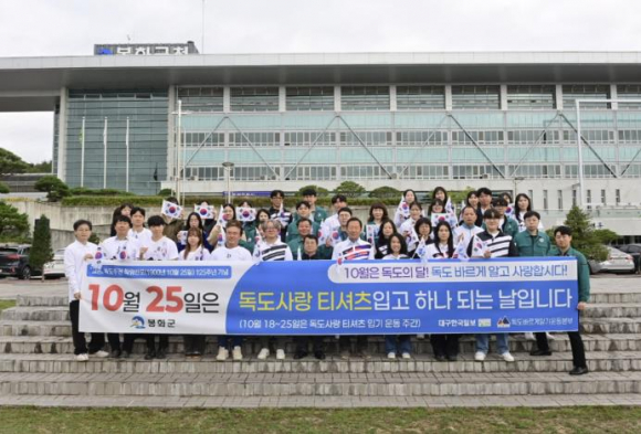 봉화군은 10월 25일 ‘독도의 날’을 맞아 군청 잔디광장에서 ‘우리 땅 독도 사랑하기 운동’을 전개하며 독도 수호 의지를 다졌다.23일 열린 행사에서는 독도사랑 티셔츠를 착용한 봉화군청 직원 60여 명이 ‘독도는 우리 땅’노래와 함께 태극기를 흔들며 독도 사랑을 외쳤다.또한 각 읍면에서도 독도의 날을 알리고, 독도사랑 티셔츠 입기 운동에 동참하는 등 봉화군 곳곳에서 독도의 날을 기념하는 마음을 함께 나눴다.봉화군은 매년 독도의 날을 맞아 독도 티셔츠 입기 운동과 기념행사를 꾸준히 이어오며, 공직자들의 독도 수호 의식을 높이는 데 적극적으로 노력하고 있다.박현국 봉화군수는 “오늘 기념행사를 통해 봉화군 공무원 모두가 독도의 소중함을 되새기고, 올바른 역사 인식과 공직자상을 갖추어, 독도 수호에 앞장서길 바란다.”라고 전했다.