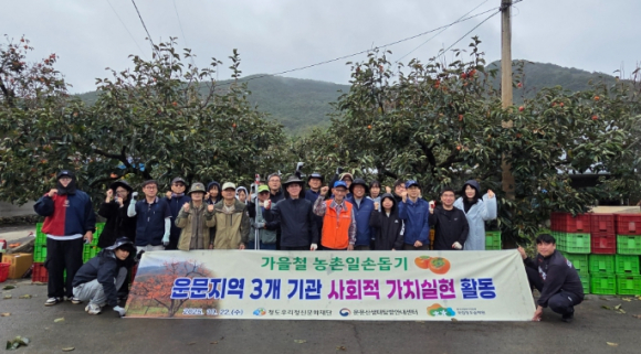 청도군 운문면 지역 내 3개 기관이 함께하는 ‘사회적 가치실현 활동’이 10월 22일 진행됐다.이번 활동은 농촌의 일손 부족 해소와 지역사회 상생을 위해 마련된 자리로, 청도우리정신문화재단·운문산생태탐방안내센터·청도숲체원 등 3개 기관이 한뜻으로 참여했다. 이날 20여명의 직원들은 운문면 방지리 농가를 방문해 청도의 대표 농산물인 반시 수확과 감꼭지 따기, 수확물 정리 등을 함께 진행하며 구슬땀을 흘렸다. 이번 일손돕기는 기관 간 협력으로 추진된 연합활동으로, 단순한 봉사활동을 넘어 지역민과의 교류를 확대하고 협력 네트워크를 강화하는 의미 있는 자리로 평가받았다.기화서 청도우리정신문화재단 대표는 “운문에서 대표할 수 있는 3개의 기관이 함께 뜻을 모아 지역 농가를 지원할 수 있어 더욱 의미가 크다며 앞으로도 지역사회와 상생하는 사회공헌 활동을 지속적으로 이어가겠다.”고 밝혔다.