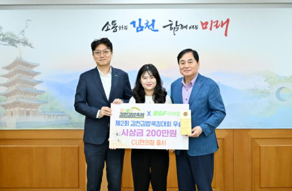 『2025 김천김밥축제』의 공식 행사인 제2회 김천김밥쿡킹대회 우승 김밥이 축제 당일 공개와 함께 현장에서 판매된다. 올해로 2회째 개최된 김천김밥쿡킹대회는 김천김밥축제의 메인 이벤트이며, BGF리테일과 협업하여 지역 특산물을 활용한 김밥을 발굴하고 축제의 정체성을 확립하는 데 그 목적이 있다. 지난 7월 참가자 모집 후 본선 진출 15개 팀(1팀 2명)이 선발됐으며, 8월 30일 김천대학교에서 전문가 평가(60%)와 현장 참가자 평가(40%)를 거쳐 금상·은상·동상 각 1팀과 입선 12팀이 선정됐다. 대망의 우승을 차지한 우승 김밥은 김예지·박진희(대구)팀이 만든 ‘호두마요제육김밥’으로, 김천의 쌀 브랜드‘금물쌀’로 밥을 하고. 지역 특산품 호두와 지례흑돼지를 사용해 매콤함과 고소함이 조화롭게 어우러진 맛을 완성했다. ‘호두마요제육김밥’은 축제 당일 무지링존 내 CU 편의점에서 판매되며, 10월 28일 전국 CU 편의점에 출시된다. 배낙호 김천시장은 “전국에서 관심을 갖고 참여해 준 참가자들에게 감사의 인사를 전한다. 김밥축제와 더불어 김밥쿡킹대회의 브랜드 가치를 높일 수 있도록 지속적으로 지원하겠다.”라고 말했다. 한편, 금상·은상·동상 수상자에게는 상패와 함께 금상 2백만 원, 은상 1백 5십만 원, 동상 1백만 원의 시상금이 각각 수여되며, 입선팀에는 상장과 시상금 50만 원이 수여된다.