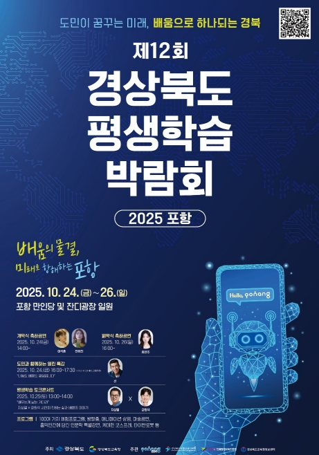 경상북도는 10월 24일부터 26일까지 3일간 포항 실내체육관 및 만인당 일원에서 ‘2025년 경상북도 평생학습박람회’를 개최한다.올해로 12회째를 맞는 이번 박람회는 평생학습에 대한 인식 제고, 지속적인 학습 참여 촉진 및 관계기관의 확산 의지 고양을 위해 마련된 평생학습 축제의 장으로 꾸며진다. 경상북도와 경상북도교육청이 공동 주최하고 포항시, 포항교육지원청, 경상북도평생교육진흥원, 경상북도교육정보센터가 주관하는 이번 박람회는 ‘도민이 꿈꾸는 미래, 배움으로 하나되는 경북!’이라는 주제로 도민과 관광객 누구나 즐길 수 있는 전시 체험형 축제로 담아낼 예정이다. 특히 이번 박람회는 22개 시군이 평생교육 배움을 통해 그동안 갈고닦은 솜씨와 열정을 도민과 함께 나누고 우수 평생학습 사례를 공유하고, 관람객들에게 다양한 ▴체험거리 ▴볼거리 ▴즐길거리를 제공한다. 실내체육관에서 열리는 개막식에는 양금희 경상북도 경제부지사, 도의원, 도 교육감, 포항시장을 비롯한 평생교육 대학·기관·단체장, 관람객 등 500여명이 참석하는 가운데 진행된다.또한 개막식 사전행사로 도내에 거주하고 계신 70세 이상 어르신들이 참여하는 골든벨 대회가 열려 경상북도의 사적 및 보물, 시사, 안전 관련 문제를 두고 실력을 뽐낸다.박람회 주요 행사로는 시군 홍보·체험부스와 전 세계적인 열풍을 이끌고 있는 애니메이션‘케이팝 데몬 헌터스’의 코스프레가 열린다. 또한, 타이탄로봇 퍼포먼스와 마술공연, 애니메이션 상영까지 도민 누구나, 가족단위 함께 참여할 수 있는 볼거리가 마련되어 이목이 집중되고 있다. 24일에는‘나눔도 배움도 평생입니다’라는 주제로 가수 션의 특강이 열리고, 25일에는 개그맨 지상렬과 시인 강원석이 이끄는 평생학습 토크콘서트도 열린다. 26일에는 경북도 내 청소년과 성인 평생학습동아리 19개 팀이 경합을 벌여 그동안 갈고 닦은 동아리의 실력을 유감없이 발휘하는 무대가 펼쳐진다.만인당 실내에 마련된 평생학습 작품전시관에서는 가죽공예, 천아트, 3D 프린팅, 어반스케치 등 시군에서 발굴한 학습동아리의 학습 결과물을 전시하고, 성인문해 시화전은 ‘문해교육으로 달라진 나의 인생’을 주제로 경북지역성인문해 교육기관 학습자들이 쓴 100여점의 시화작품이 전시되어 있어 감상할 수 있다. 이 밖에도, 슐런대회, 역사문화 특별강연, 평생학습 화합 한마당, XR 체험관, 평생학습 학술행사 등 다채로운 프로그램이 마련됐다.양금희 경상북도 경제부지사는 “새로운 지식을 끊임없이 습득하고 미래 역량을 강화하는 평생학습은 선택이 아닌 필수시대이다. 모든 도민이 행복한 평생학습 공동체를 만들어 가는데 도가 더욱 힘을 보태겠다”고 밝혔다.