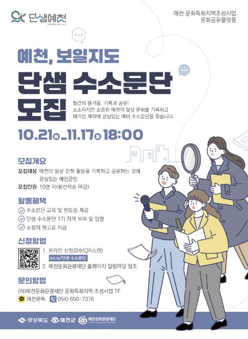 예천군과 (재)예천문화관광재단은 예천 문화특화지역 조성사업의 일환으로 추진하는 ‘예천, 보일지도’의 ‘단샘 수소문단’ 프로그램 참여자를 11월 17일까지 모집한다.‘예천, 보일지도’의 ‘단샘 수소문단’은 예천 군민이 지역 문화의 능동적인 기록 주체로 성장하도록 역량을 강화하고, 향후 예천 문화를 담는 매거진을 제작할 인력을 양성하는 것을 목표로 한다.이번 프로그램은 예천의 일상 문화를 주제로 취재 및 기사 작성법을 배우고 현장 취재를 실습하는 교육 과정으로 구성되며 인원은 선착순 10명 내외를 모집한다.김학동 이사장은 “예천의 일상을 기록하고 지역 문화의 가치를 높이는 활동에 군민들의 많은 참여와 관심을 바란다”고 전했다.