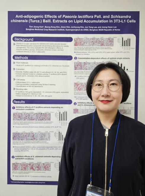 경상북도농업기술원 봉화약용작물연구소 고은정 박사는 지난 16일 충청북도 제천시에서 개최된 ‘2025년 한국약용작물학회 추계학술 발표회’에서 학술발표상을 받았다.고은정 박사는 ‘작약 및 오미자 추출물의 3T3-L1 세포 내 지질축적 억제 효과’를 주제로 연구 결과를 발표했으며, 작약과 오미자 추출물이 지방세포 내 지질축적을 효과적으로 억제함으로써 비만 예방 및 체지방 감소 기능성 소재로의 활용 가능성을 제시한 점에서 높은 평가를 받았다.봉화약용작물연구소는 이번 연구성과를 바탕으로 지난 5월 체지방 감소 효과를 갖는 작약 추출물 및 작약·오미자 복합추출물 제조방법에 대한 2건의 특허를 출원했으며, 약용작물 기반 기능성 소재의 산업화 가능성을 한층 높였다.이번 수상은 봉화약용작물연구소가 지속적으로 추진해 온 약용작물의 기능성 검증과 산업화 연구가 결실을 맺은 것으로, 향후 약용작물 산업화 연구의 방향을 제시한 의미 있는 성과로 평가된다.또한, 이번 연구는 경북 지역특산 약용작물의 과학적 가치를 입증하고, 농가 소득 증대와 연계한 모델 구축에 이바지할 것으로 기대된다.조영숙 경상북도농업기술원장은 “지역특산 약용작물의 경쟁력 강화를 위해서는 고부가기치화와 산업화가 필요하다”며 “앞으로도 지역 약용작물을 활용한 기능성 소재 개발과 산업화 연구를 통해 지역 농가 소득 향상과 산업 기반 강화에 기여하겠다”고 말했다.