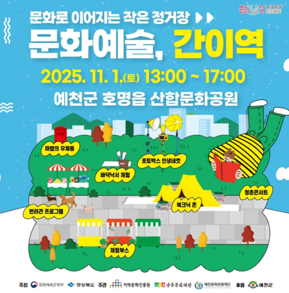 (재)예천문화관광재단은 11월 1일 예천군 호명읍 산합문화공원(걷고싶은 거리)에서 ‘문화예술, 간이역’ 10월 프로그램을 개최한다. ‘문화예술, 간이역’은 문화체육관광부와 지역문화진흥원이 주관하고, (재)예천문화관광재단이 주최하는 ‘2025 문화가 있는 날 구석구석 문화배달’ 사업의 일환으로, 일상 속에서 문화를 자연스럽게 접하고 다양한 문화 향유 기회를 누릴 수 있도록 기획된 지역 밀착형 프로그램이다. 이번 프로그램은 9월에 이어 두 번째로 진행되는 야외형 문화행사로, 단풍으로 물드는 가을 정취 속에서 다채로운 공연과 체험이 어우러진 프로그램으로 구성됐다. 주요 프로그램으로는 싱어송라이터 ‘어치브’와 ‘퓨전국악 이어랑’이 함께하는 청춘콘서트, 가족 단위 관객을 위한 마술과 버블쇼, 환경문제 인식을 높이는 체험형 콘텐츠 ‘리사이클 정류장’, 감성을 자극하는 독서 프로그램 ‘북적북적 북크닉’이 준비된다. 특히 이번 북크닉에서는 예천 출신의 그림작가 송태고 작가와 함께하는 북 토크 콘서트와 클레이 체험 프로그램도 함께 진행되어 지역 예술가와의 교류를 통해 문화적 의미를 더할 예정이다. 또한 추억을 남길 수 있는 ‘인생네컷 사진관’과 사연을 나누는 ‘마법의 우체통’ 등도 마련돼 다양한 즐길 거리를 선사한다. 김학동 이사장은 “이번 행사가 군민들이 일상 속에서 문화를 자연스럽게 즐기고 휴식할 수 있는 계기가 되길 바란다”며, “예천문화관광재단은 앞으로도 지역 곳곳에서 누구나 함께 참여할 수 있는 문화예술 향유의 기회를 지속적으로 확대해 나가겠다”고 전했다. 한편, ‘문화예술, 간이역’은 오는 11월 29일에 올해의 ‘마지막 문화가 있는 날’ 프로그램을 선보일 예정이며, 자세한 내용은 예천문화관광재단 누리집 또는 공식 인스타그램에서 확인할 수 있다.