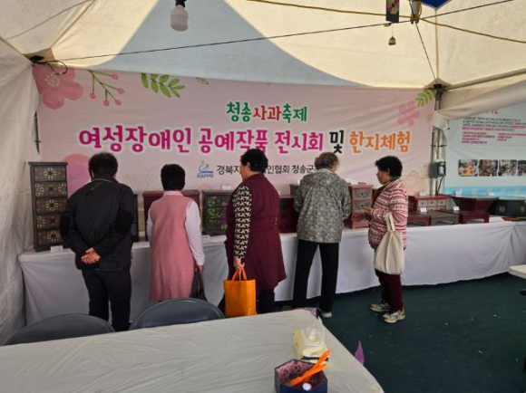 (사)경북지체장애인협회 청송군지회는 지난 10월 29일부터 11월 2일까지 열린 제 19회 청송사과축제에서 여성장애인 작품전시 및 한지공예체험 부스를 운영해 큰 호응을 얻었다.이번 체험은 여성장애인의 창작활동을 널리 알리고 지역사회와 소통할 수 있는 기회를 마련하기 위해 진행됐다. 하루 30명 정원으로 운영된 한지공예체험은 조기 마감될 정도로 인기가 높았으며, 오전·오후 2회차로 진행돼 5일간 총 156명이 참여했다.현장에는 여성활동가 4명이 오전·오후 교대로 강의를 진행하며 참여자들의 작품 완성을 도왔다. 참여자들은 한지를 이용해 전통공예의 멋과 정성을 느끼며 자신만의 작품을 완성했다.특히 전시된 여성장애인들의 작품은 많은 방문객들의 눈길을 끌며 “섬세하고 따뜻한 감성이 느껴진다”는 호평을 받았다현갑삼 지회장은 “이번 체험을 통해 여성장애인들이 예술적 재능을 지역사회와 나누고 자립의 자신감을 키우는 계기가 됐다”며 “앞으로도 장애인과 비장애인이 함께 어울릴 수 있는 문화 프로그램을 지속적으로 운영하겠다”고 전했다.