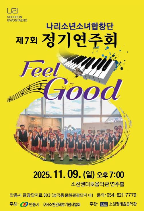 (사)소천권태호선생기념사업회가 주최․주관하는 ‘제7회 나리소년소녀합창단 정기연주회’가 11월 9일 오후 7시, 소천권태호음악관 실내 연주홀에서 개최된다.이번 연주회는 한 해를 마무리하는 시점에서 어린이와 시민에게 따뜻한 음악의 감동을 전하고, 동요 작곡가 소천 권태호 선생의 정신을 기리기 위해 마련된 무대다.지휘 김혜경, 트레이너 손영은, 반주 김화연, 안무 이지은 선생의 지도 아래, 안동 지역 초등학교 2학년부터 중학생으로 구성된 40여 명의 단원이 아름다운 하모니를 선보일 예정이다.공연은 클래식부터 재즈까지 다양한 장르로 꾸며진다. Stage 1에서는 `Gloria Canon` 등 클래식의 정수를 담은 곡들이, Stage 2에서는 `다 잘될 거야`, `별` 등의 동요를 통해 희망의 메시지를 전한다. Stage 3에서는 경쾌한 재즈 리듬의 `Feel Good`과 `We go Together`로 흥겨운 분위기를 더하고, Stage 4에서는 `대한독립 만세`, `영원하라 대한민국` 등 웅장하고 감동적인 합창으로 피날레를 장식한다.소천권태호음악관은 2014년 개관 이래, 안동 출신 성악가이자 동요 작곡가, 한국 현대음악의 선구자인 소천 권태호 선생의 뜻을 기리며, 지역 어린이와 청소년의 음악교육 및 공연 활동을 통해 예술적 감성과 인성을 함께 키워가는 장으로 자리매김해 왔다.소천권태호음악관 관계자는 “이번 연주회는 어린이들의 맑고 순수한 목소리를 통해 따뜻한 위로와 희망을 느끼는 시간이 되길 바란다”고 전했다.