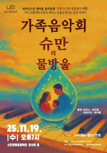 (사)소천권태호선생기념사업회가 주최․주관하는 기획공연 피아니스트 정아름 음악동화 ‘우물 속 작은 물방울의 여행’이 11월 19일 오후 7시, 소천권태호음악관 실내 연주홀에서 개최된다.이번 공연은 유치원부터 초등 저학년 어린이, 그리고 부모․조부모 세대가 함께 관람할 수 있는 가족 음악회로 꾸며지며, 동화와 클래식 음악이 어우러진 특별한 무대로 관객들에게 색다른 감동을 선사할 예정이다.음악동화 ‘우물 속 작은 물방울의 여행’은 깊은 우물 속에서 살아가던 작은 물방울이 세상 밖으로 나와 다양한 친구들을 만나고, 강물을 따라 바다에 이르기까지 성장하는 이야기를 담고 있다. 부르크뮐러의 〈소녀의 기도〉로 시작되는 우물의 고요한 분위기, 슈만의 〈아라베스크〉를 통해 표현되는 세상 밖으로의 첫걸음, 〈이국과 사람들〉․〈트로이메라이〉 등에 녹아 있는 우정과 감정의 변화 등, 19세기 낭만주의 피아노 명곡들이 이야기의 흐름을 섬세하게 그린다. 피아노 연주와 내레이션이 조화롭게 어우러져, 마치 한 편의 애니메이션을 눈앞에서 보는 듯 생생한 음악의 풍경을 펼쳐낼 예정이다.소천권태호음악관 관계자는 “이번 공연은 어린이들에게는 상상력을, 가족들에게는 감동을 선물하는 시간이 될 것”이라며 “음악을 통해 세대가 함께 소통하고 공감할 수 있는 특별한 무대가 될 것”이라고 전했다.무료로 진행되는 본 공연에 대한 자세한 내용은 전화와 누리집을 통해 문의 및 확인할 수 있다.