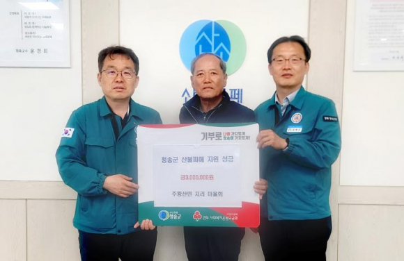 청송군은 주왕산면에서 산불 피해 극복을 위한 성금 기부가 잇따르고 있다고 밝혔다. 지난 7일에는 지리 마을회가 300만 원, 주산지리에 거주하는 손두호 씨가 100만 원을 주왕산면사무소에 기부하며 산불 피해 이재민들에게 따뜻한 위로와 응원의 메시지를 전달했다. 또한, 주왕산면사무소 직원 일동도 200만 원을 기탁하며 지역사회를 위한 따뜻한 나눔에 동참했다. 한편, 지난 7일까지 주왕산면에 기부된 성금은 총 7,983만 원으로, 지역사회 복구를 위해 많은 분들이 따뜻한 마음을 모아주었다. 지리 윤재문 이장은 “작은 나눔이지만 산불피해로 어려움을 겪고 계신 이웃들의 피해극복에 조금이나마 도움이 되기를 바라는 마음으로 마을주민들이 함께 정성을 모아 기부했다.”라고 밝혔다. 김태규 주왕산면장은 “주왕산면민들의 성금기부에 감사드리며, 기부해주신 성금은 산불피해 극복에 소중히 사용하겠다.”라고 전했다.