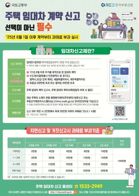 경상북도는 주택 임대차 계약 신고 계도기간이 오는 5월 31일 종료됨에 따라 6월 1일 이후 체결된 주택 임대차 계약을 30일 이내에 신고하지 않으면 과태료가 부과되므로 반드시 신고를 당부했다.주택 임대차 계약 신고제는 임대차 시장의 실거래 정보를 투명하게 공개하고 임대인과 임차인 간 정보 비대칭을 극복하기 위한 목적으로 2021년 6월부터 시행됐다.다만, 도민 부담과 행정 여건 등을 고려해 과태료를 한시적으로 부과하지 않는 계도기간을 4년간(2021.6.1.~2025.5.31.) 운영해 왔으며, 이달 5월 31일 종료를 앞두고 있다.주택 임대차 계약 신고 대상은 도내 시 지역의 보증금 6천만원 이상이거나 월세 30만원을 초과하는 주거목적의 주택 임대차 계약이다.주택 임대차 계약 신고는 임대인, 임차인 모두에게 신고 의무가 있으나 일방이 신고하더라도 서명·날인된 계약서를 제출하면 공동 신고로 간주한다.주택 소재지 관할 읍면동 행정복지센터를 방문하거나 온라인으로 부동산거래관리시스템에 접속해 본인 인증 후 신고하면 된다.배용수 경북도 건설도시국장은 “주택 임대차 계약 시에는 반드시 30일 이내에 신고할 것을 당부드린다” 며 “신고 지연으로 과태료가 발생하지 않도록 지속적인 제도 홍보에 힘쓰겠다”고 밝혔다.