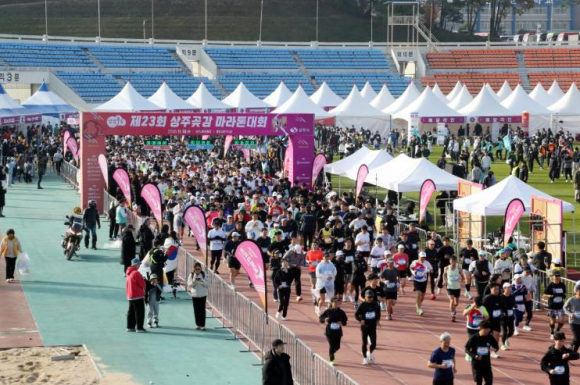상주시에서는 지난 16일 시민운동장 주경기장에서 전국 마라토너 8,700여 명이 참가한 가운데`제23회 상주곶감 전국마라톤대회`를 성황리에 마무리했다. 전국마라톤협회 주최와 전국마라톤협회 영남지사, 상주시육상연맹 및 상주마라톤클럽 주관으로 열린 이번 대회는 시민운동장을 출발해 충의사, 경천섬, 상주보 일원으로 달리는 4km, 10km, Half, Full 코스로 진행됐으며 비교적 온화한 날씨 속에서 상주의 아름다운 늦가을 정취를 만끽할 수 있었다. 행사장 내에서는 국민 마라토너 황영조 선수 사인회, 기록 인증 포토존 설치, 완주 매달 각인 등 다채로운 프로그램이 진행됐으며 상주시 농특산품 홍보 부스를 설치하고 참가자 전원에게 상주곶감을 무료로 지급하는 등 상주곶감을 전국에 널리 알리고 지역 경제를 활성화하는 데에도 큰 기여를 했다. 특히 이날 대회는 많은 인파에도 불구하고 상주경찰서의 긴밀한 협조 아래 새마을교통봉사대, 모범운전자회, 상주시 MTB, 자율방범대 등 200여 명이 도로 통제 및 안전관리 요원으로 투입되어 안전사고 예방에 총력전을 펼쳐 단 한 건의 안전사고 없이 무사히 대회를 마무리할 수 있었다. 강영석 상주시장은“23회째를 맞는 이번 전국마라톤대회의 원활한 진행을 위해 많은 분이 협조해주신 덕분에 안전하고 성공적인 대회로 막을 내렸다”라며 감사의 인사를 전하고, “전국 단위 대회 유치뿐만 아니라 상주의 도약을 널리 알리고 지역경제를 활성화하는 데에 앞으로도 최선을 다하겠다”고 말했다.