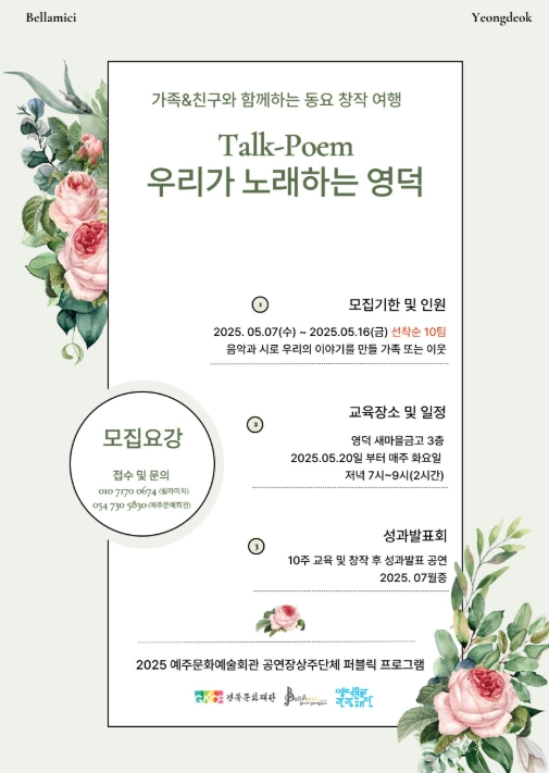 (재)영덕문화관광재단은 오는 20일부터 예주문화예술회관과 벨라미치문화예술연구소가 함께 진행하는 퍼블릭 예술교육프로그램 `Talk-Poem, 우리가 노래하는 영덕`의 수강생을 모집한다고 밝혔다. 본 프로그램은 (재)경북문화재단이 주최하는 2025 공연장상주단체육성지원사업의 일환으로 공연예술단체와 공연장이 협력해 지역민의 문화 향유 기회를 넓히고 공연장 운영을 활성화하기 위해 기획됐다. 올해 예주문화예술회관 상주단체로 선정된 벨라미치문화예술연구소는 예술교육과 군민이 함께하는 창작 활동을 통해 공동체의 회복과 결속을 돕게 된다. ‘가족, 친구와 함께하는 동요 창작 여행’이란 주제로 진행되는 본 프로그램은 자신이 쓴 시와 그림이 음악으로 완성되고 직접 발표 무대를 갖는, 총 10회 과정의 예술교육이다. 참여자들은 가족, 고향 등 자신의 이야기를 시와 그림으로 표현하며 예술을 통해 서로를 공감하고 공동체 의식을 갖게 된다. 특히 최근 산불 등 재난을 겪은 주민들을 위한 치유 프로그램도 함께 운영된다.벨라미치문화예술연구소는 2014년 창단 후 청년 예술가를 중심으로 레퍼토리 개발, 시민 음악교육, 사회봉사 등 다양한 예술 활동을 펼쳐왔다. `클래식으로 읽는 명작소설 : 어린왕자` 공연과 시니어 대상 방문예술교육 등 지역 친화적인 프로그램은 벨라미치의 대표 사업으로 인정받고 있다. 이번 `Talk-Poem, 우리가 노래하는 영덕`은 오는 20일부터 7월까지 매주 화요일 수업을 열고, 교육을 수료한 참가자들은 마지막 수업으로 공연 무대에 직접 올라 그동안 준비한 작품을 군민들과 함께 나누는 뜻깊은 시간을 갖게 된다. 참여를 원하는 군민은 5월 16일까지 전화로 신청하면 된다. 선착순 10팀을 모집하는데 2인 이상의 개인, 가족, 이웃은 누구나 신청할 수 있다. 예주문화예술회관과 벨라미치문화예술연구소는 이번 퍼블릭 예술교육 외에도 하반기에 는 창작 공연‘뮤지컬 칸타타 파도 속의 외침: 장사상륙작전’과‘클래식으로 읽는 명작소설: 어린왕자’공연도 준비하고 있다. 예주문화예술회관 관계자는“이번 프로그램이 예술을 통해 자신의 이야기를 나누고 서로를 이해하는 뜻깊은 기회가 될 것”이라며 “클래식과 문학이 만나는 흔치 않은 시간인 만큼 많은 관심과 참여를 바란다”고 말했다.자세한 내용은 영덕문화관광재단 홈페이지(https://ydct.org)에서 확인 가능하며 교육 문의는 영덕문화관광재단(054-730-5836)으로 하면 된다.