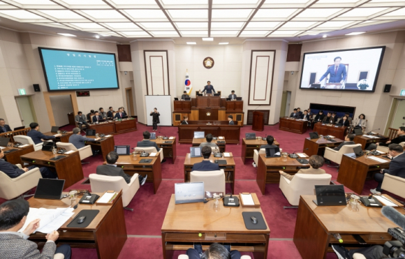 구미시의회는 11월 25일 제282회 제2차 정례회 제1차 본회의 개회를 시작으로 12월 17일까지 23일간의 의사일정에 돌입했다. 본회의에 앞서 정지원 의원은 5분 자유발언을 통해 ‘구미 피지컬 AI 융합 도시’로의 전략적 전환과 정책 기반 마련 방안을 제안했다. 제1차 본회의서는 구미시장 및 관계공무원 출석 요구의 건과 2026년도 예산안 시정연설 및 제안설명이 이루어 졌으며, 13명의 예산결산특별원회 위원을 구성하고 김영길 의원을 위원장으로 선출했다. 이번 정례회의 주요 의사일정으로는 11월 25일 제1차 본회의 후 11월 26일부터 12월 3일까지 각 상임위원회 활동기간으로 의원발의조례안(9건) 등 각종 안건심사와 2026년도 예산안 및 기금운용계획안(2조 2,320억원)에 대한 예비심사가 진행된다. 이어서 12월 4일부터 10일까지 예산결산특별위원회 활동기간으로 구미시에서 제출한 2026년도 예산안 및 기금운용계획안에 대한 심도있는 심사가 진행되며, 12월 11일에는 제2차 본회의를 열어 앞서 각 위원회에서 심사한 조례안 등 각종 안건과 2026년도 예산안을 처리할 예정이다. 또한 12월 12일부터 16일까지 각 상임위원회 및 예산결산특별위원회에서 2024년도 제2회 추가경정예산안 및 기금운용계획변경안에 대한 심사를 거쳐 17일 제3차 본회의에서 안건을 처리하고 23일간의 의사일정을 마무리할 계획이다. 박교상 의장은 개회사를 통해 “지나온 한 해를 되짚어보고 올 한해 추진한 사업과 성과를 시민의 눈높이에서 면밀히 되돌아 보고 다가오는 2026년을 잘 설계할 수 있는 예산안 심사에 만전을 기해줄 것을 당부하며”“시민의 대의기관으로 시정을 감시하고 견제하는 역할을 수행하며, 변화하는 환경 속에서 필요한 정책 대안을 제시하고, 시민의 목소리가 시정에 온전히 반영되도록 하는 것이 우리 의회에 주어진 중요한 책무”라는 것을 다시 한번 확인했다.