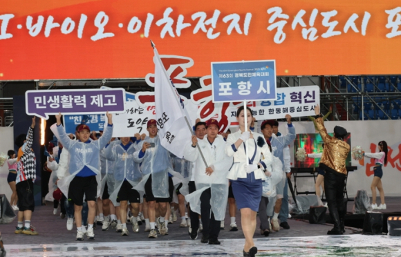 포항시가 9일 김천에서 막을 올린 제63회 경북도민체육대회에서 본격적인 메달 사냥에 돌입했다.이번 대회에 포항시는 30개 종목, 83개 부문에 선수 및 임원 1,270여 명이 참가해 종합우승을 목표로 열띤 경쟁을 펼치고 있다.9일 김천종합운동장에서 열린 개회식에서는 포항시 선수단이 선수, 임원, 읍면동 체육회를 포함해 70여 명 규모로 입장하며 관중들의 뜨거운 환호를 받았다. 입장 퍼레이드에서는 ‘AI·바이오·이차전지·수소 중심도시’ 포항의 위상을 적극 홍보하며 눈길을 끌었다. 이강덕 포항시장은 개회식에 앞서 포항시체육회 관계자들과 볼링, 복싱, 탁구 등 경기장을 찾아 선수들을 일일이 격려하며 선전을 기원했다.또한 종목별 지역 기업과 단체로 구성된 시민 서포터즈들도 궂은 날씨를 뚫고 경기장을 찾아 열띤 응원으로 선수단에 힘을 보탰다.이날 저녁 열린 선수단 환영 행사에서는 사전경기에서 골프, 농구, 핸드볼, 자전거, 사격 등 여러 종목에서 1위를 기록한 포항시 선수단의 활약이 소개됐으며, 이 시장은 “남은 본경기에서도 끝까지 최선을 다해 달라”고 당부했다.이재한 포항시체육회장은 “그동안 땀 흘리며 훈련에 임해준 선수들에게 감사드린다”며 “마지막까지 집중해서 후회 없는 경기로 유종의 미를 거둬주길 바란다”고 말했다.이강덕 시장은 “포항은 언제나 체육으로 하나가 되어 왔고, 이번 대회에서도 선수들의 땀과 노력이 시민들에게 큰 힘이 돼줄 것”이라며 “지금의 열기가 끝까지 이어질 수 있도록 포항 시민과 함께 선수단을 힘껏 응원하겠다”고 말했다. 한편 제63회 경북도민체육대회는 9일부터 12일까지 김천시 일원에서 30개 종목(정식 28, 시범 2) 경기가 치러지며, 12일 김천실내체육관에서 열리는 폐막식을 끝으로 마무리된다.