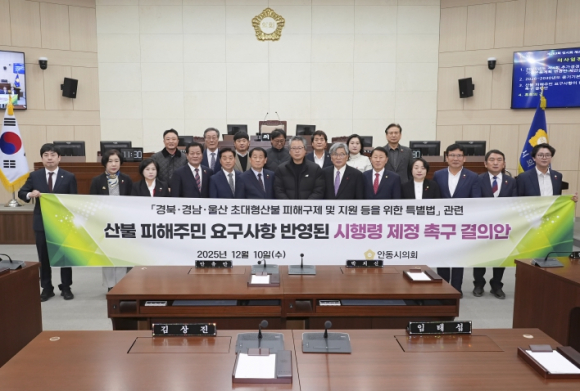 안동시의회가 `경북·경남·울산 초대형산불 피해구제 및 지원 등을 위한 특별법`관련 산불 피해주민 요구사항이 반영된 시행령 제정 촉구 결의안을 채택했다.결의안은 산불피해대책특별위원회(이재갑 위원장)가 12월 10일 열린 제263회 안동시의회 제2차 정례회 제2차 본회의에서 발의했다.결의안에는 지난 3월 발생한 초대형 산불 피해 보상을 위해 마련된 특별법이 시행됐음에도 지원 기준 및 요건, 재건위원회 구성에 관한 사항 등 상당한 부분이 시행령에 위임됨에 따라 피해 주민들의 요구사항 및 의견이 충분히 반영된 시행령을 제정해야 한다는 내용을 담았다.이재갑 위원장은 “특별법 제정에도 불구하고 핵심 내용의 상당 부분이 시행령으로 위임되어 있어, 실제 어떻게 구체화 될지 심각한 우려가 제기되고 있다”라며, “시행령이 온전한 피해 보상을 담보하지 못할 경우 피해 주민들은 분노할 수밖에 없고 지역사회는 대형산불이라는 사회적 재난에 더해 절망이라는 심리적 재난에 또다시 무너질 수밖에 없다”라고 지적했다.이에, 산불피해대책특별위원회는 재건위원회에 피해 주민의 실질적 참여 보장, 실질적이고 공정한 보상 기준을 마련, 피해 사각지대에 놓인 주민들을 위한 지원 규정 마련, 한정된 예산은 피해 주민의 실질적 보상에 집중하라며 시행령 제정을 촉구했다.