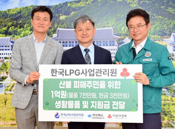 경상북도는 한국 LPG 사업관리원 손승진 원장이 12일 경북도청을 방문해 산불 피해지역 지원을 위한 성금 및 구호 물품 전달식을 개최했다.이날 전달된 성금은 총 3,000만원으로 청송군, 영양군, 영덕군에 각 1,000만원씩 전달되며, 파스, 생수, 마스크 등 약 7,000만원 상당의 구호 물품도 함께 사회복지공동모금회를 통해 기탁됐다.손승진 원장은 “산불 피해로 어려움을 겪고 있는 주민들께 조금이나마 힘이 되길 바라는 마음으로 성금과 물품을 준비했다”며 “앞으로도 지역사회에 힘이 되는 나눔을 지속해 나가겠다”고 말했다.경상북도지사는 “어려운 시기에 지역사회를 위한 따뜻한 나눔을 실천해 주신 한국 LPG 사업관리원에 깊이 감사드리며 기탁해주신 성금과 물품은 피해 주민들이 하루빨리 일상을 회복할 수 있도록 소중히 활용하겠다”고 밝혔다.한편, 기탁된 성금과 물품은 사회복지공동모금회를 통해 피해지역 주민들의 복구 및 지원 활동에 투명하게 사용될 예정이다.