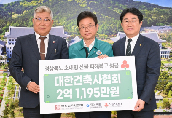 대한건축사협회, 경상북도건축사회를 비롯한 시・도 건축사회 관계자들이 9일 도청을 방문해 산불 복구 성금 2억 1,195만원을 전달했다. 성금은 초대형 산불로 큰 피해를 본 5개 시군 이재민을 지원하기 위해 마련됐으며, 지역의 복구 활동과 이재민 지원에 사용될 예정이다.대한건축사협회에서는 성금 이외에도 5개 시군 이재민에게 필요한 세탁기, 청소기 등 17억원 상당의 구호 물품도 지원할 계획이다. 김재록 대한건축사협회 회장은“전례 없는 초대형 산불로 인해 수많은 마을이 소실되고 삶의 터전을 잃어버린 이재민들을 위해 전국 회원들이 마음을 하나로 모아 성금과 구호 물품을 준비했다. 이재민에게 작게나마 위로가 되기를 바란다.”라고 전했다.한편, 경상북도건축사회는 성금 전달과 함께 피해 건축물의 신속한 회복을 지원하고자 경북도와 업무협약을 체결하고 설계비․감리비 50% 감면, 피해지역 읍・면・동에 건축 상담 부스 설치・운영 등 지역 재건을 위해 지역 건축사들의 지속적인 재능기부도 이어나갈 예정이다. 송동훈 경상북도건축사회 회장은“건축물이 가지는 문화적 가치를 그 누구보다 잘 알고 있는 지역 건축사들의 재능기부로 더 나은 지역으로의 상생과 발전에 보탬이 되겠다.”라고 전했다.이철우 도지사는“대한건축사협회를 비롯한 17개 시․도 건축사회 여러분의 관심과 지원에 깊은 감사를 드린다. 각계각층에서 보내주고 계신 온정의 손길이 헛되지 않도록 복구 차원을 넘어 새로운 경북으로 도약하는 전화위복의 계기 마련에 최선을 다하겠다.”라고 답했다.
